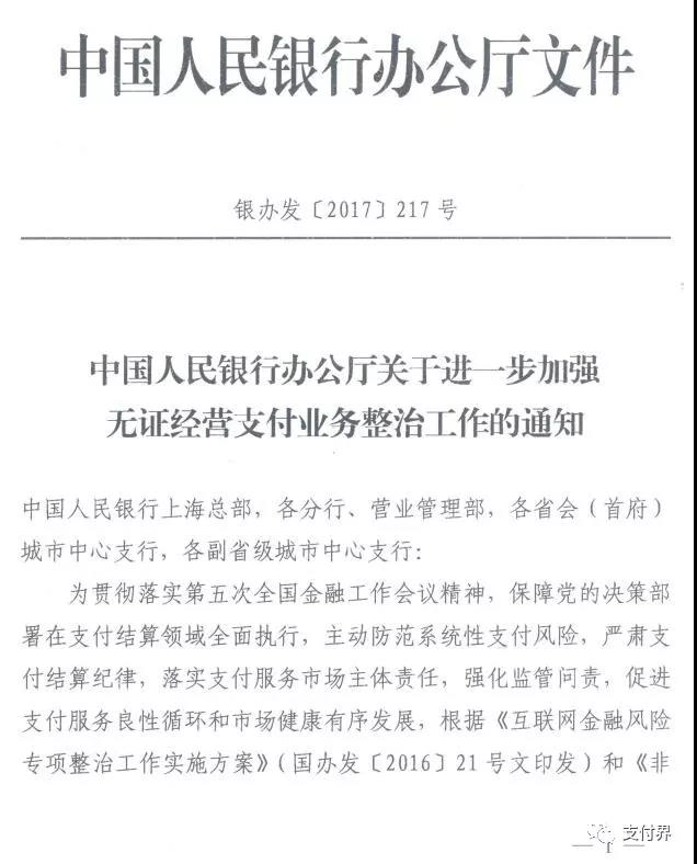 最新消息,中国人民银行办公厅发布《关于进一步加强无证经营支付业务整治工作的通知》(银办发[2017]217号),针对无证支付机构进行集中整治,整治时间也有了明确的要求:
