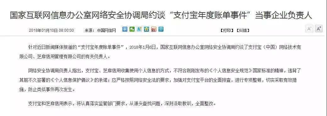 针对近日新闻媒体报道的“支付宝年度账单事件”,2018年1月6日,国家互联网信息办公室网络安全协调局约谈了支付宝(中国)网络技术有限公司、芝麻信用管理有限公司的有关负责人。
